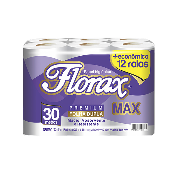 Papel Higiênico Folha Dupla Híbrido Florax Premium. Pacote c/ 12 rolos.