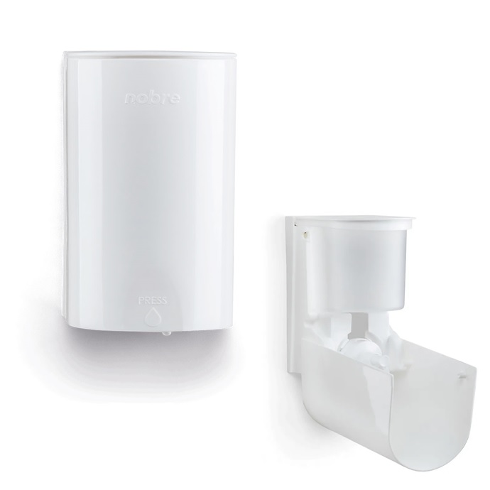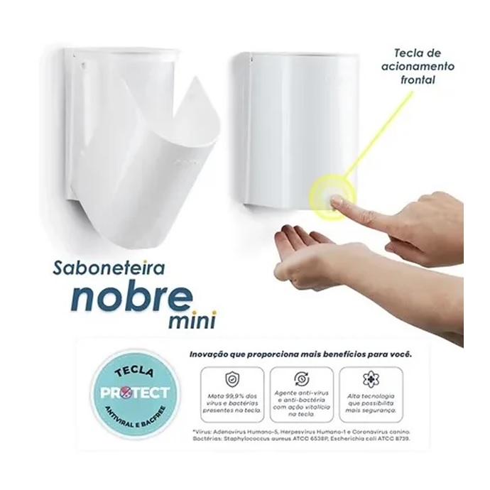 É prática. É compacta. É Nobre. Saboneteira Nobre Mini. Possui acionamento frontal, com a tecla embutida na face frontal da saboneteira. E agora com mais facilidade para abastecimento, com tampa superior prática para acesso rápido ao reservatório. Com Tecla Protect. Agente anti-vírus e anti- bactéria com ação vitalícia. Inovação que proporciona mais benefícios para você. Mãos livres de vírus e bactérias*. Mata 99% dos vírus e bactérias presentes na tecla. Alta tecnologia que possibilita mais segurança. Válvula líquida XPro, indicada para sabonete líquido, alcool gel, detergente para louça e shampoo. Ideal para banheiros, cozinhas ou áreas comuns. Use em consultórios, lojas, escritórios, hotéis, recepção e em ambientes onde quiser garantir higiene e proteção.